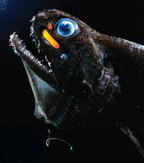 This species of dragonfish exhibits a high degree of sexual dimorphism (difference in physical traits in the same species). The female (pictured above) looks like a beast from a horror movie. The male is not only smaller in size, it has no teeth, no barbel and does not hunt. It is only around for reproduction. In the dark depths of the ocean and with such small eyes, how does this predatory fish scope out its prey? By providing its own light, in the form of photophores, aligned on the side of its body and under its eyes. The fish will light up completely in the dark and glow with an eerie blue-green or reddish light. The barbel of the female also lights up at the tip. The light is powerful enough for the fish to find its prey in the dark.