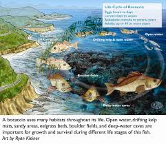 The Bocaccio, Sebastes paucispinis, is a member of the Sebastidae (rockfish) family. Other names for this species include salmon grouper, grouper, tom cod (juveniles), and slimy[citation needed]. In Greek, sebastes means “magnificent,” and paucispinis is Latin for “few spines”. Bocaccio can be found from Stepovak Bay, Alaska to central Baja California, but is mostly abundant from Oregon to northern Baja California. They have been spotted from various depths from the surface to 1,568 feet (478 m); most live between 150-1,000 feet.Juveniles stay in shallower water because of the protection provided by floating kelp mats or driftwood. Shallow water kelp forests and oil platforms also help these fish avoid danger, as they can use them to dodge and hide from predators. As the fish get older, they to move into deeper, colder water. The Monterey submarine canyon is an ideal place for many marine organisms to inhabit or migrate through, and bocaccio in this canyon can consume multiple marine species such as shellfish (pelagic shrimp and crab), anchovies, sardines, other small rockfishes, and squid.