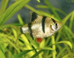 The Albino Tiger Barb is and attractive color morph of the Tiger BarbPuntius tetrazona. The basic form of this variety has a yellow or creamy colored background with whitish stripes. There are a number of Albino variations that emphasis a gold and platinum background. They all sport beautiful red accents on the nose and fins. Mature specimens do tend to fade a bit, but still a school of these lively fish in a nice sized aquarium makes an awesome display. The biggest difference between these and the Tiger Barbs is that Albinos do not always have gill covers. When first introduced in the aquarium hobby these fish were received with mixed reactions. This mostly seemed to relate to a matter of taste. Some folks fell in love with these little pretties, while others were indifferent. Consequently they had been less poplar than the regular Tiger Barbs, but were still readily available. However with some of the great developments in red, gold, and platinum strains, they are becoming more sought after. These are called such things as Gold Tiger Barb, Golden Platinum Tiger Barb, Albino Golden Tiger Barb, Red Tiger Barb, Blood Red Tiger Barb, and so forth.