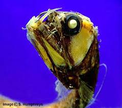 This species of dragonfish exhibits a high degree of sexual dimorphism (difference in physical traits in the same species). The female (pictured above) looks like a beast from a horror movie. The male is not only smaller in size, it has no teeth, no barbel and does not hunt. It is only around for reproduction. In the dark depths of the ocean and with such small eyes, how does this predatory fish scope out its prey? By providing its own light, in the form of photophores, aligned on the side of its body and under its eyes. The fish will light up completely in the dark and glow with an eerie blue-green or reddish light. The barbel of the female also lights up at the tip. The light is powerful enough for the fish to find its prey in the dark.