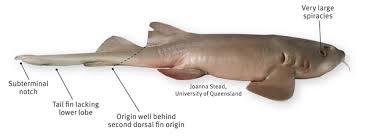 The blind shark, Brachaelurus waddi, lives only in Australian waters of the Pacific Ocean, from the Northern Territory to New South Wales, living in the near-shore reefs and sea grass beds. It is nocturnal, resting in reef crevices and caves in the daytime. Despite its name it is not blind, but has a habit of closing its eyes when held out of the water. It is related to the Colcloughs Shark, Heteroscyllium colcloughi. Blind sharks are light to dark chocolate brown with white specks on the back and sides. Juveniles have dark bands on the body that fade as they mature. It has has a slightly flattened head, small eyes and a nasal barbel projecting from both nostrils. A large spiracle is behind each eye which allows the blind shark to root around about in silt without affecting its breathing. They feed at night on anemones, cuttlefish, crabs, shrimp and small fish, and are very wary of divers. Blind sharks are ovoviviparous, producing eggs that are retained inside the female until hatching occurs, giving birth to live pups around six inches long. The reach around four feet long at maturity.
