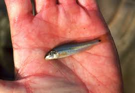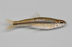 The bluntnose minnow has stout half ray in front of the usual 8 rays on the dorsal fin and the scales on the back between the head and dorsal fin are small and squished together. There is a dark spot of pigment on the first two or three dorsal rays about mid way up the fin. Bluntnose minnows have a rounded head and slightly sub-terminal (ending below tip of snout) mouth. They have dark edges to the scales which gives them the appearance of a crosshatching pattern over much of their body. Breeding males can be very dark in coloration and have 3 rows of large pointed tubercles (horn like bumps) on there snout. They also have a spongy pad on the back between the head and dorsal fin. The bluntnose minnow differs from the closely related fathead minnow by a dark mid lateral stripe that runs from the snout to the tail with a black spot at the base of the tail. This stripe can be absent when they are caught from muddy water but the black spot is usually still visible. They also have a complete lateral line, which the fathead minnow does not have. Another closely related species, the bullhead minnow, differs by having not as long and slender of a body, also lacks a distinct lateral stripe, and has a dark crescent shaped mark of pigment on the side of the snout. Both of these species lack the dark scale edges that give the bluntnose minnow a crosshatched appearance.